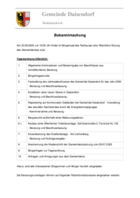 Gemeinde Daisendorf Bodenseekreis Bekanntmachung Am 23.09.2025 um 19:00 Uhr findet im Bürgersaal des Rathauses eine öffentliche Sitzung des Gemeinderates statt. Tagesordnung öffentlich: 1. …